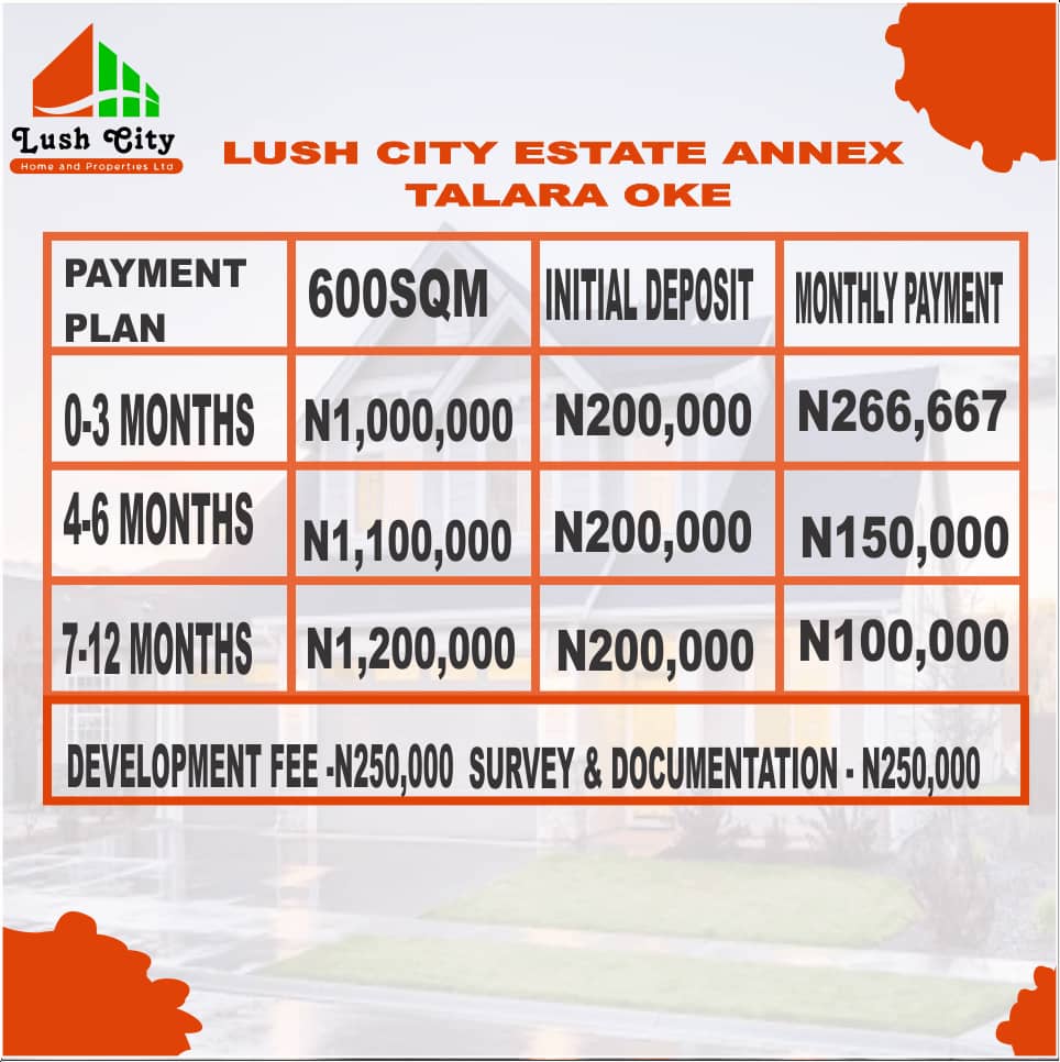 Lush City Estate Phase 1 Annex is located at Talara Oke via Igbonla Ilara Town Epe, Lagos State Nigeria. It’s only a few minutes drive away from Augustine University in Ilara, Epe Lagos State Nigeria.